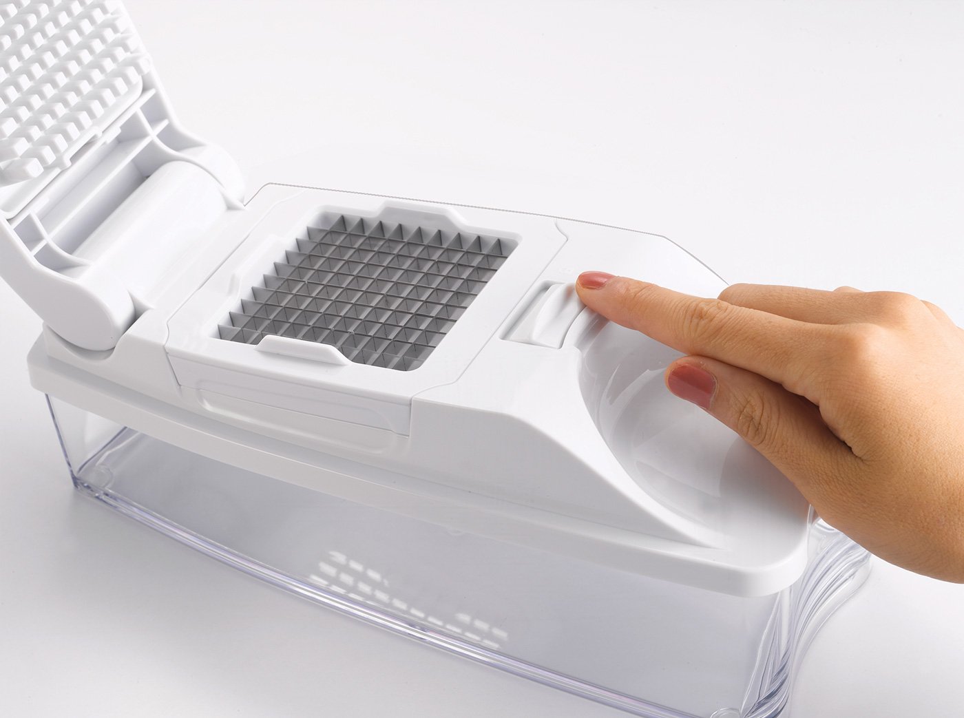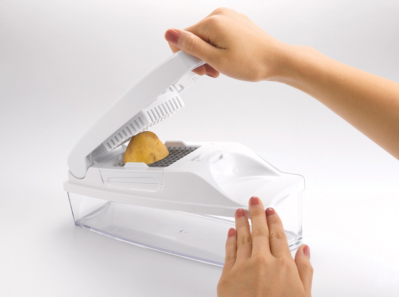 Denn er spart beim Kochen Zeit und Kraft: Obst, Gemüse, Kräuter, Käse, Eier, Pilze oder Wurst sind im Handumdrehen gewürfelt oder in Stifte geschnitten. Pommes sind da schnell selbst gemacht und auch ein feiner Obstsalat ist ganz fix fertig.