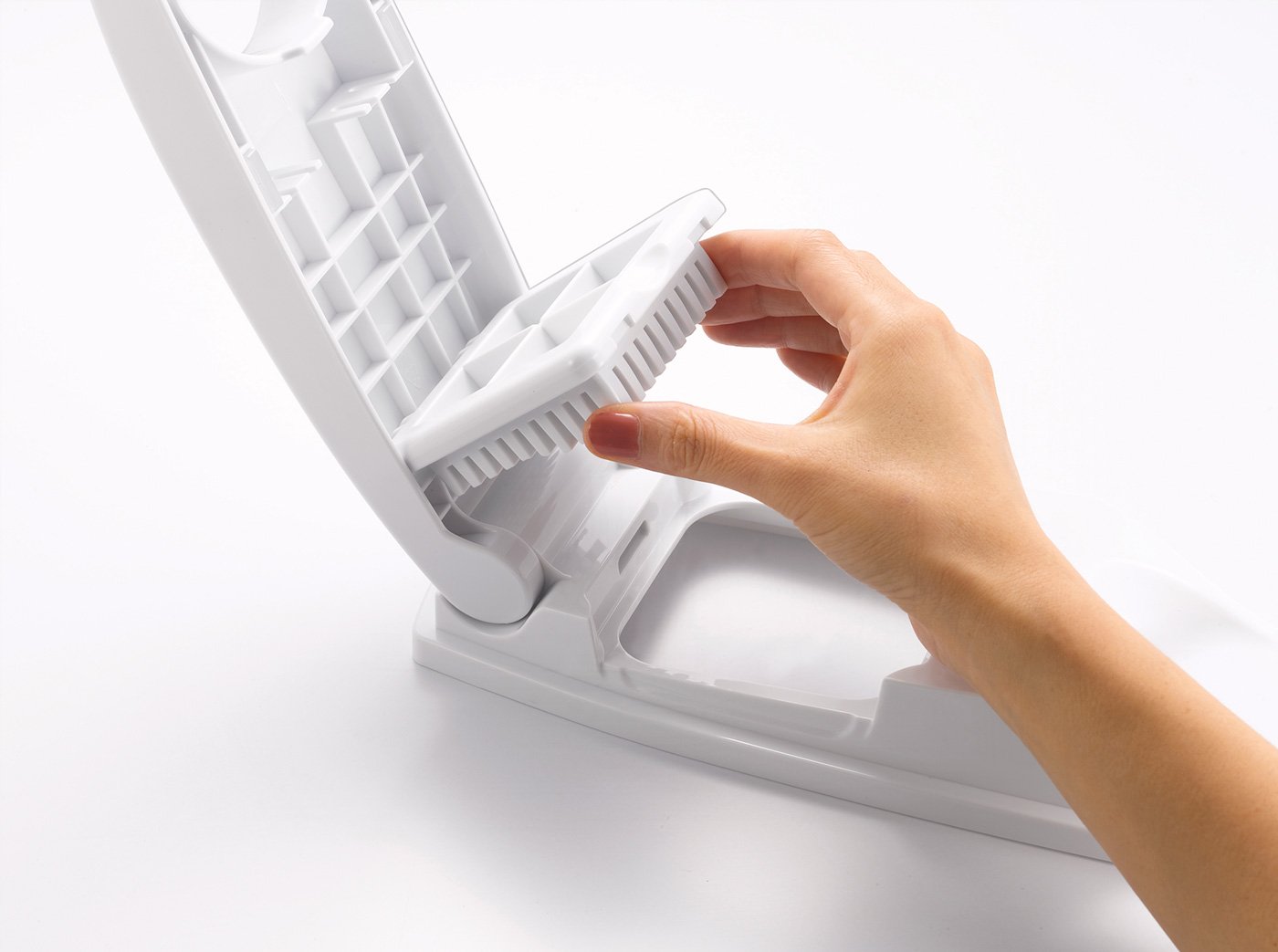 Der Cubic Gemüseschneider ist zudem absolut sicher in der Anwendung. Denn mit den Schneideeinsätzen kommen Ihre Finger beim Zerkleinern der Lebensmittel gar nicht erst in Berührung. Kraft müssen Sie auch bei etwas härterem Gemüse kaum aufwenden – dank der durchdachten Hebelwirkung. Besonders praktisch ist der Auffangbehälter aus lebensmittelechtem Kunststoff. Er lässt sich mit einem Deckel sauber verschließen und eignet sich hervorragend zur Aufbewahrung im Kühlschrank. Zum Verstauen im Schrank können Sie alle Einzelteile des Cubic platzsparend ineinander stecken. Drei Einsätze stehen zur Verfügung. Die Klingen sind aus hochwertigem, japanischem Edelstahl. Alle Teile des Cubic sind spülmaschinenfest und können mit dem zugehörigen Reinigungspinsel gesäubert werden.