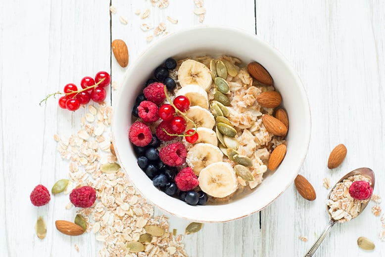 Die Haferflocken in einer Schüssel bereitstellen und Masse aus dem Kugelbehälter dazugeben und mit Milch verrühren.